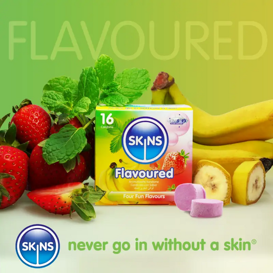 Unleash Pleasure with Skins Condoms Flavours Cube 16 Pack
