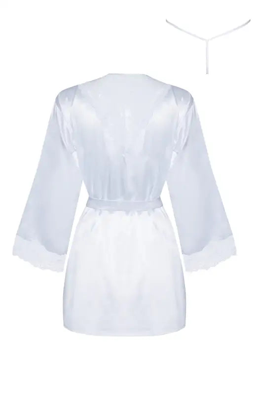 Indulge in the essence of luxury with the Sherie Peignoir White. This exquisite robe, crafted from premium satin, provides an unparalleled blend of comfort and sophistication. Key features include: Luxurious satin fabric: Designed to drape beautifully, this robe envelops your body in sumptuousness and style. Elegant lace details: The delicate lace inserts at the sleeves and neckline add a feminine touch, enhancing the visual appeal of this stunning piece. Flattering fit: With a waist tie, you can effortlessly adjust the robe for the perfect silhouette. Matching thong: Complete your ensemble with the coordinating thong for a chic and polished look. Gift-ready packaging: Delivered in an elegant box, this peignoir makes a fabulous gift for a loved one or a delightful treat for yourself. Elevate your wardrobe with the Sherie Peignoir White, ideal for romantic nights and luxurious mornings.