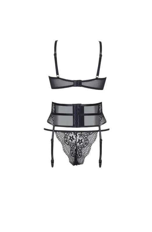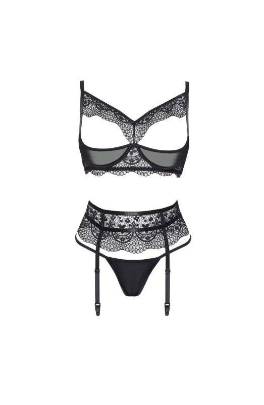 Discover the alluring three piece Chiara Set from Beauty Night, featuring an enticing open cup underwired shelf bra, a stylish matching suspender belt, and a delicate thong. Made from luxurious black lace, this set combines stunning aesthetics with a soft, comfortable feel. Please note that nipple covers are not included, but we offer a variety of nipple covers available for separate purchase. This exquisite set is elegantly packaged in a beautiful Beauty Night box.