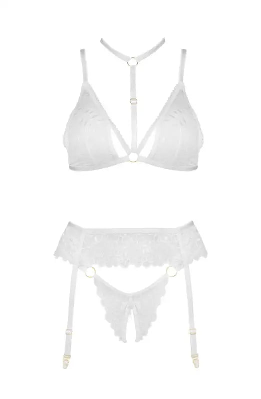 Experience the allure of the Noemi Lingerie Set in elegant white. This exquisite set includes a bra, open thong, and garter belt, all crafted from delicate lace that highlights your natural curves while radiating femininity and sensuality. Key features include high-quality lace for a luxurious feel, a striking white color that enhances your beauty, and transparent materials that gently embrace the body. The adjustable straps and fastenings provide a perfect fit, while the intricate lace detailing adds sophistication to both the bra and thong. Designed for comfort, this set is perfect for all-day and all-night wear. It's an ideal gift, beautifully packaged in an elegant box with product images, making it perfect for special occasions. The Noemi white set is a must-have addition to your wardrobe, combining luxury and sensuality to make every woman feel cherished.