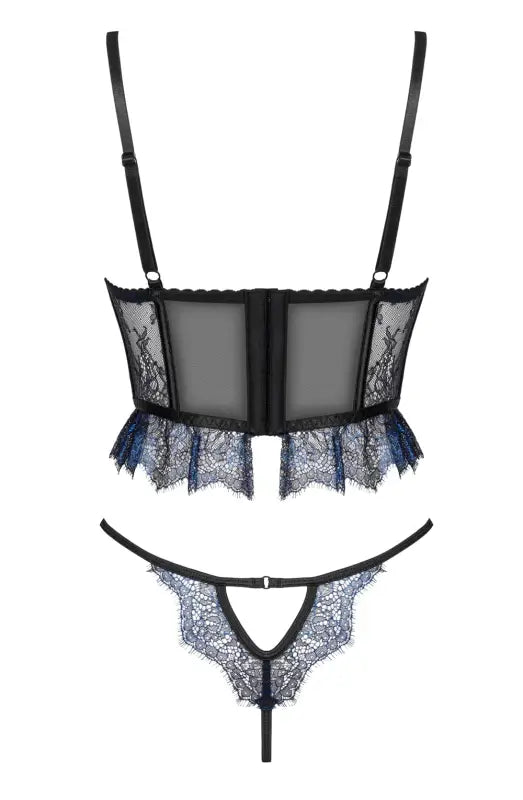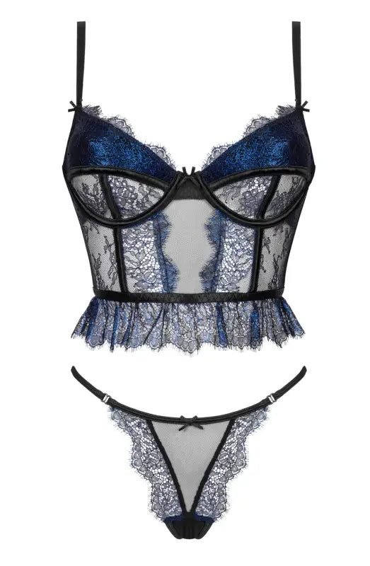 Transform your intimate moments with the exquisite Beauty Night BN6740 Saphira Set, a romantic lingerie ensemble that includes a sophisticated short corset and matching panties. This luxurious set is crafted from soft black tulle and stunning metallic sapphire lace, creating an aesthetic that embodies elegance and allure. The corset features supportive boning both in and below the cups, adjustable straps for a personalized fit, and a secure hook closure that enhances your silhouette. The beautifully designed panties complete this enchanting look. Each set is elegantly packaged, making it perfect for gifting or indulging yourself.