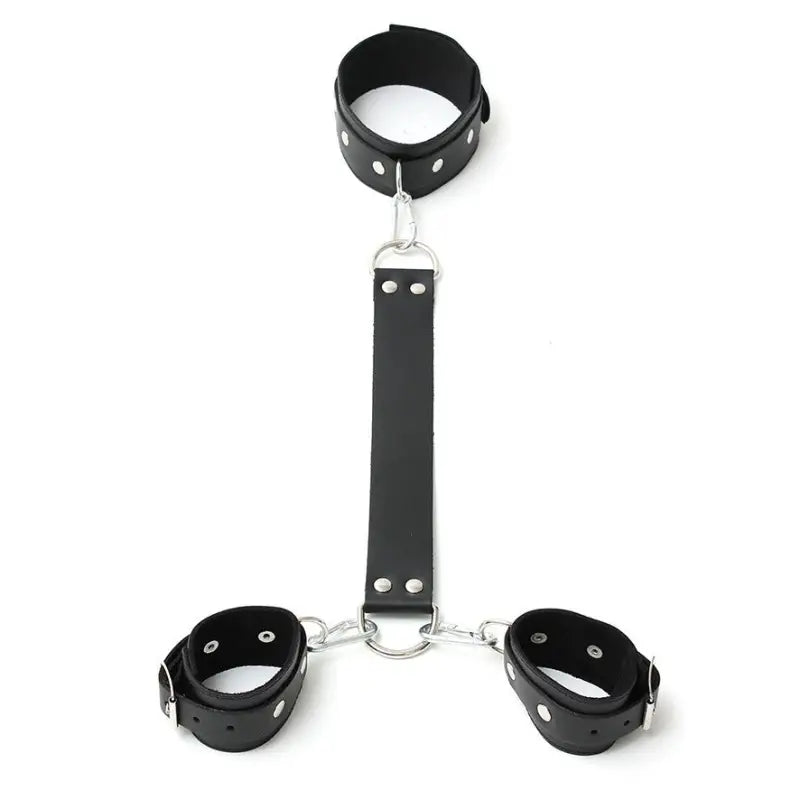 Genuine leather neck to wrist back cuff combination, with carabine hooks, adjustable with buckles.