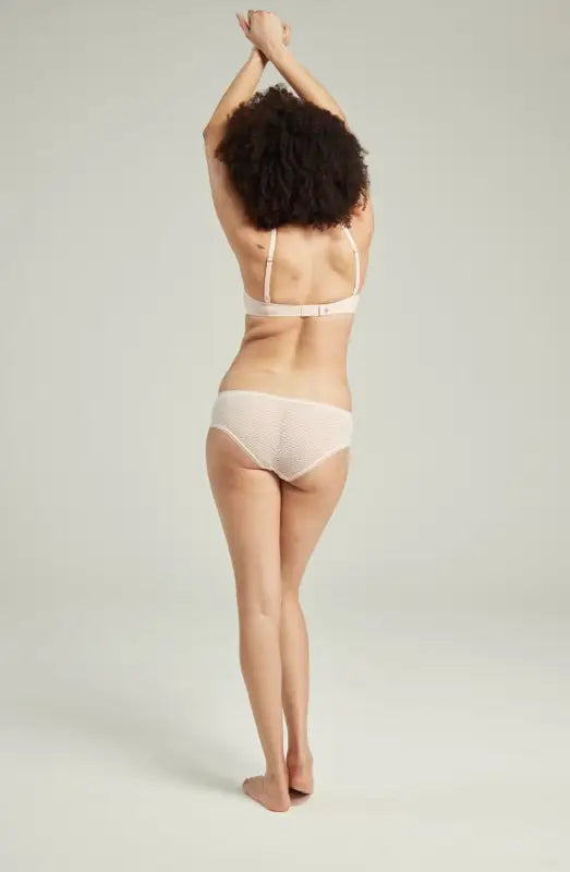 This stylish everyday bra combines modern design with a classic balconette lift. Crafted from delicate recycled lace, it features an elegant 1920s art deco aesthetic. Made sustainably with recycled materials, this bra includes double mesh for enhanced support and coverage. The multiway adjustable straps allow for versatile styling, including cross back, halter, and overarm options. With four hooks designed to extend the life of your bra, simply start on the loosest hook and adjust for a perfect fit over time. Nudea underwear prioritizes sustainability through the use of recycled or natural materials and special design features that enhance durability.