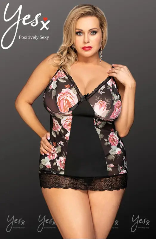 This stunning babydoll chemise features a beautiful black design with elegant floral panels. The intricate deep lace hem, along with the delicately edged cups and a charming ribbon bow at the center front, make it a captivating choice. This set includes a matching thong and arrives beautifully packaged.