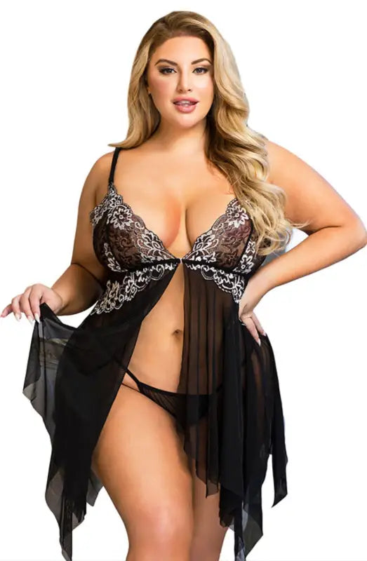 Experience elegance with this stunning babydoll featuring floaty fabric and adjustable shoulder straps adorned with contrasting embroidery on the cups, both front and back. The design includes a convenient centre front fastening and comes complete with a matching thong, all beautifully packaged for you.