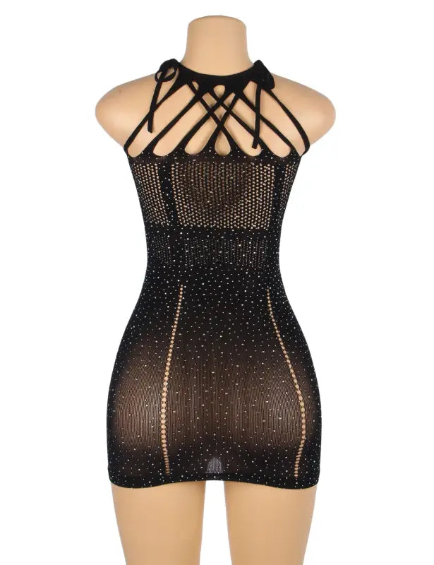 Prepare to sparkle in this stunning sheer black dress adorned with dazzling rhinestones, perfect for making a bold statement at any event. Featuring a captivating halter neckline and playful cut-out details, this dress accentuates your silhouette beautifully. The form-fitting fishnet fabric embraces your curves, ensuring you turn heads wherever you go. Ideal for an evening of glamour, this dress shines on its own—simply pair it with your favorite lingerie for a complete look. (Please note: bra, briefs, and gloves are not included.) Unleash your inner diva and create unforgettable memories!